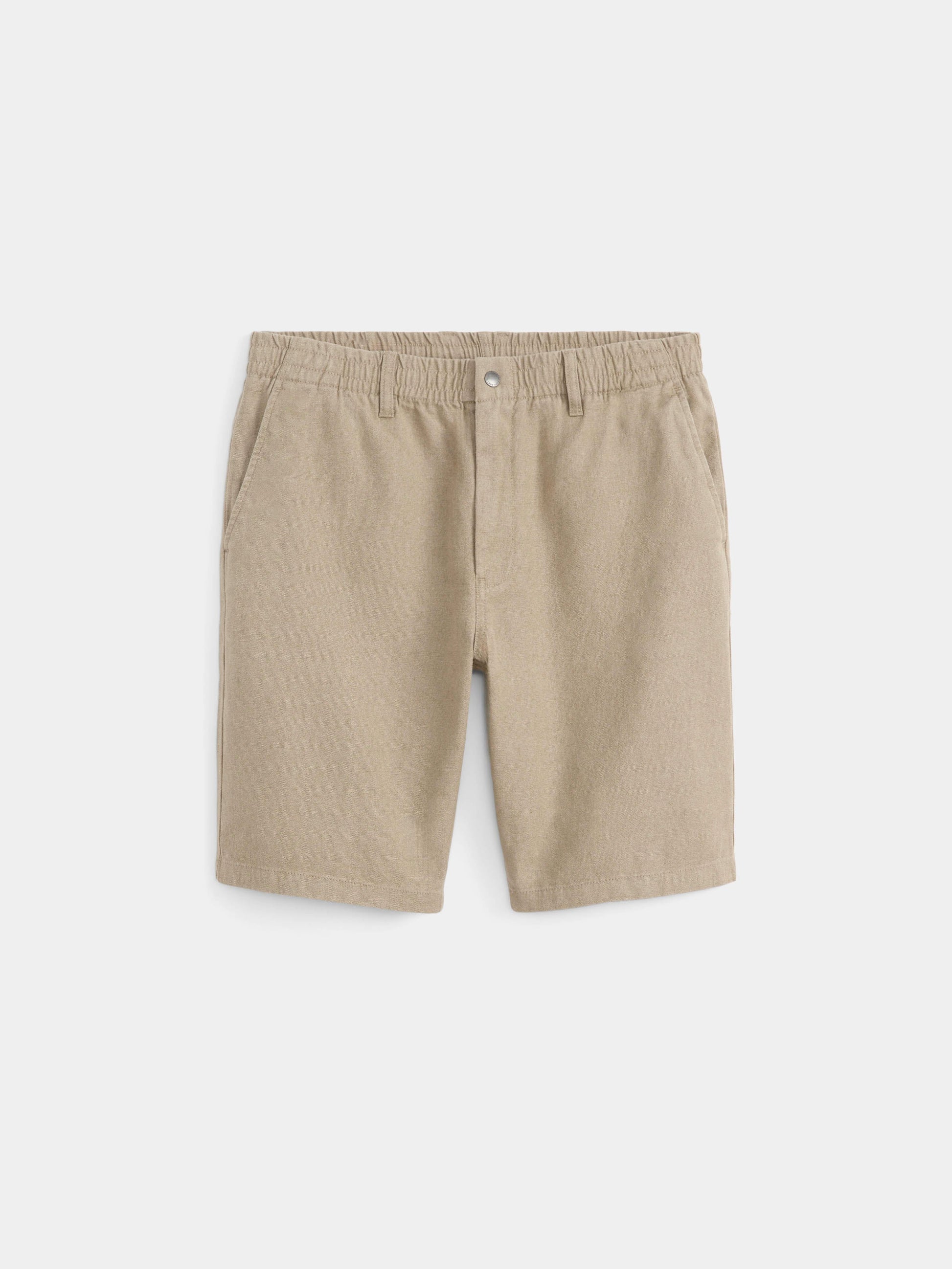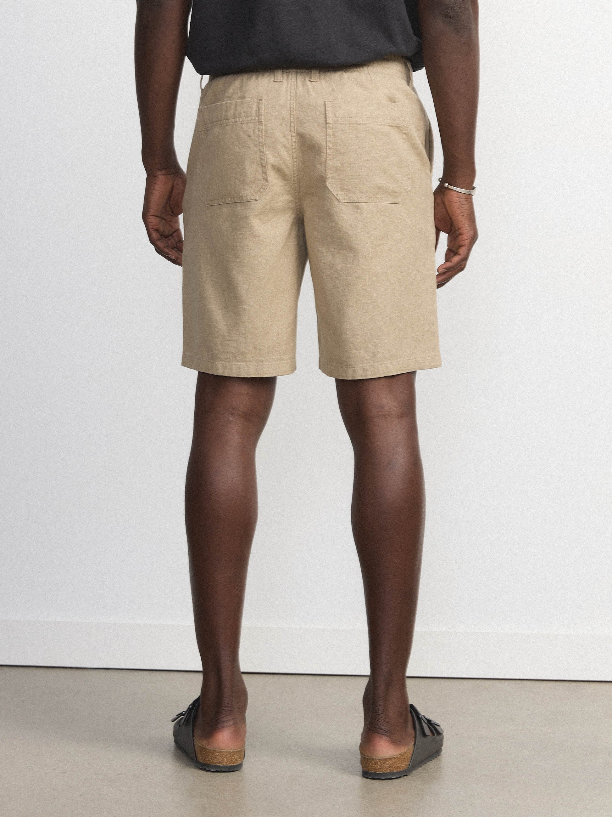 With a straight fit through the hips and a 10-inch inseam, it offers an easy, above-the-knee silhouette. The elastic waistband with a hidden drawcord provides everyday comfort, while slash front pockets and patch back pockets lend it a subtle utilitarian edge.